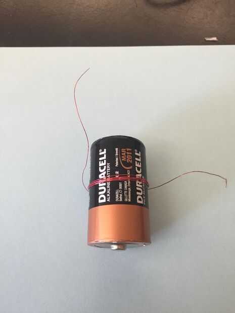 Para este paso vas a llevarte longitud brazos alambre magneto y deja sobre un plomo 2-3 pulgadas y comienza a envolver alrededor de la pila D tantas veces y tan estrecha como sea posible pero recuerden dejar también otro 2-3 pulgadas en el extremo.