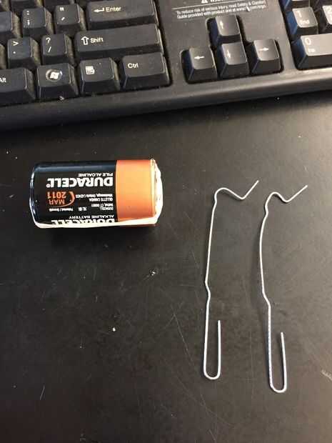 Este paso es uno de los pasos más fáciles en este instructable vas a Deslice los clips de papel en el lado positivo y lado negativo de la batería entre la goma y la batería para mantenerla en su lugar asegúrese de que cada clip se enfrenta a la misma dirección y son un poco la misma altura.