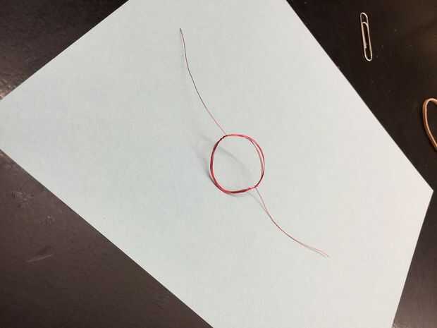 Reunir materiales:Papel de lijaBatería DBanda de goma2 clipsLongitud del brazo un cable rojo (calibre 26)ImanesPaso 1: Enrolle el cable en un círculo, dejando aproximadamente una pulgada de izquierda de alambre a cada lado.El círculo debe ser como si