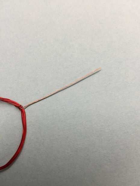 Usando el papel de lija, eliminar completamente el esmalte (capa roja) de un extremo del alambre (esto significa que el extremo que se ha enrollado en el círculo de alambre en espiral para arriba y no ese círculo sí mismo). Sabe usted que es completa cuando toda la longitud del cable es de color bronce.