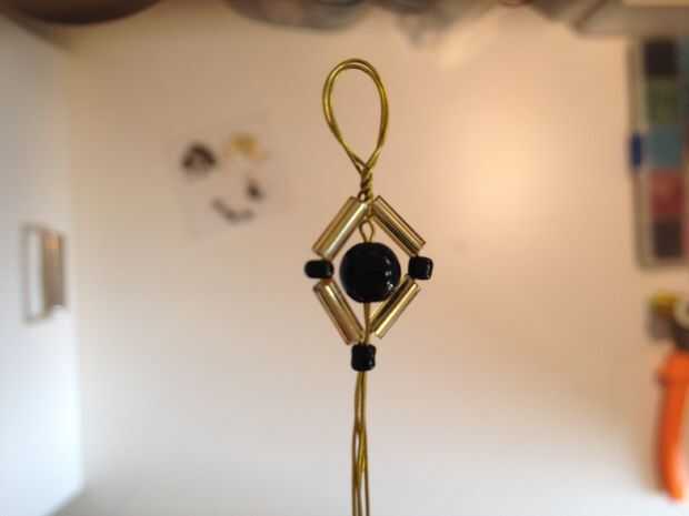 Doble ligeramente las dos cadenas exteriores en el 'más pequeño' grano de semilla negra para todos los subprocesos de hierro cuatro en el mismo lugar. Tomar un grano de semilla negra 'menor' y deslícelo sobre todo cuatro hilos, después de hacer esto terminó la primera parte de la pulsera. Ahora seguir haciendo estas formas de rombo hasta que esté lo suficientemente largos caber alrededor de su muñeca.