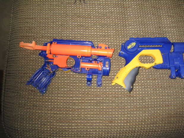 este es mi nerf nite finder han quitado los restrictores de aire y tienen streched afuera en la primavera tal vez dispara doble lo que hizo. bien así que aquí está el registro de im razón necesito ayuda tratando de convertir esto en un rifle para la
