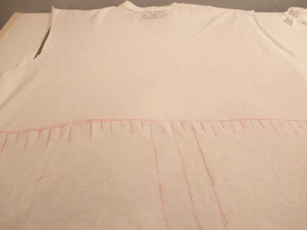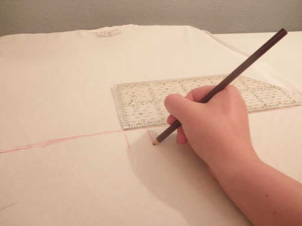 A continuación, usted querrá vuelva su camisa, mida su camisa y marque la parte inferior tercera. Mina fue de 24 pulgadas de arriba a abajo, así que marqué la parte inferior de 8 pulgadas marca haciendo una línea horizontal en la camiseta. Después de eso, hacer líneas horizontales hacia abajo cada media pulgada hacia el dobladillo.