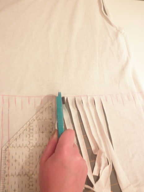 Por último, tienes que cortar a lo largo de las líneas verticales. Dobladillo de su camisa es totalmente opcional, y elegí no porque soy una costurera amateur en el mejor. Sin embargo, si usted quiere su camiseta a la última durante mucho tiempo, dobladillo puede ser una buena idea.