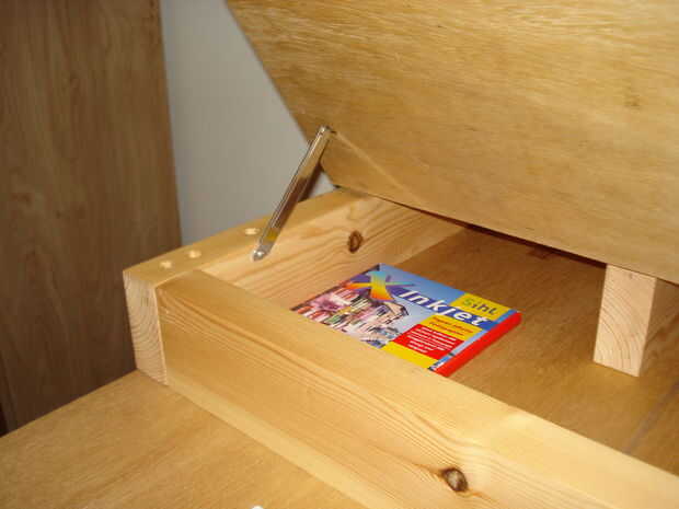 Una mesa de centro hecha de listones de madera y cama de palet reciclado. La mesa se levanta para ser utilizado como superficie de trabajo sentado y revela también un compartimiento de almacenaje debajo. Un sistema de ruedas de ricino retráctil contr