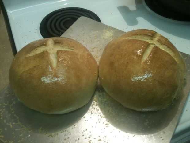 Precalentar el horno a 180 ° C (350 ° F) y cuando el pan se ha duplicado, hornear durante unos 30 minutos o hasta que estén doradas. Cuando toque la parte inferior debe sonar hueco. Si usted toma una lectura de temperatura debe ser alrededor de 94° C (200° F).