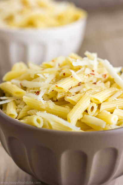 3. una vez que la pasta esté lista, escurrir el agua y verter sobre aceite de oliva extra virgen. Echar queso rallado, espolvorear con escamas de Chile y mezcla bien.