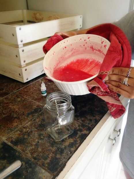 • Sostiene la taza con la toalla de mano, vierta cuidadosamente la mezcla derretida de cera, olor a aceite y colorante en el recipiente preparado