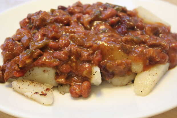 A continuación, sacar las patatas y ponerlas en un plato o en un bol. Derramar el chili caliente en la parte superior y disfruta.