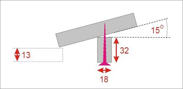 Ahora toma la camilla con la pintura, poner la Junta de construcción alrededor de 5cm de su lado y ajustar el ángulo para la Unión con la placa exterior. Debe ser alrededor de 15 grados, pero mejor verificar. Mejor hacerlo sobre una mesa, luego se puede mover de un lado para colgar sobre la mesa lo que es posible poner un tornillo a través de la construcción a la Junta exterior, como se muestra en la fotografía (antes mejor taladro un pequeño agujero para el tornillo). Girar la cosa alrededor, otro tornillo en el otro lado - debe sostener con los dos, pero pongo otro en el centro. También puede utilizar cuñas para mantener el ángulo - pensé que voy a hacer que yo mismo, pero entonces hacer lo descrito es tan fácil que yo no molestaba. Y sí, se puede ver un poco los tornillos ahora, pero estás en un lugar donde nadie nunca se ve de todos modos.