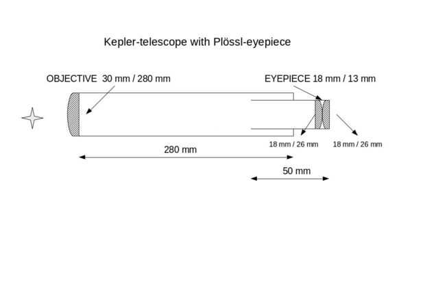 Este arreglo es una manera muy simple y muy antigua para magnificar objetos distantes. El lightbeam paralela del objeto alcanza un diámetro grande y lente colector relativamente largo enfocado, es refractada y viaja hasta el punto de enfoque, donde se pone en un diámetro pequeño, corta enfocado lente, que magnifica la imagen. El gran objetivo es el 'objetivo', el pequeño es el 'ocular'. La longitud de enfoque de la objectice y el ocular suman da la longitud total del telescopio, la relación de las lentes da el aumento. Pero en este ámbito planea un giro, porque, si pones dos lentes acromáticas similares a como se ve en la imagen, haz un ocular muy bueno con doble aumento, llamado ocular Ploessl. Así utilizamos 3 lentes con la siguiente clasificación: