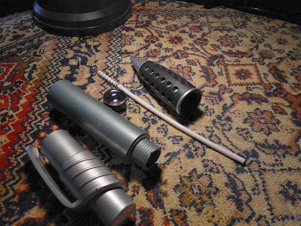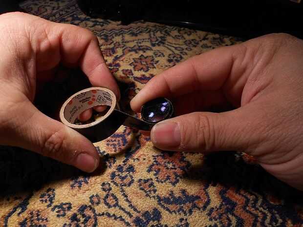 Ahora intente rodar este sistema en la cinta aislante, pero ten cuidado, no dejes que las piezas de inclinarse o moverse. La simetría axial es muy importante en este caso. Rollo untin cabe firmemente en el tubo del ocular de la unidad en la cinta y coloque en posición equilibrada, porque esta unidad debe quedar adecuadamente, en el extremo del tubo más pequeño.