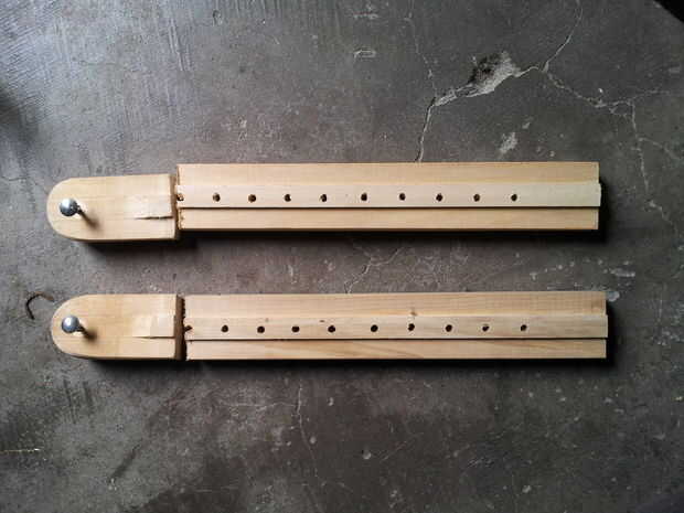 Finalmente, cortar las piezas vertical restantes a lo largo, que termina con una separación longitudinal. Otra vez, ancho no es muy importante siempre y cuando no exceda el ancho de su perno y tuerca de mariposa por demasiado. Hice unos 1.5-2 cm de ancho (aproximadamente 0,8 '')