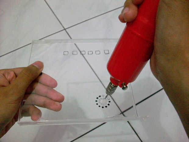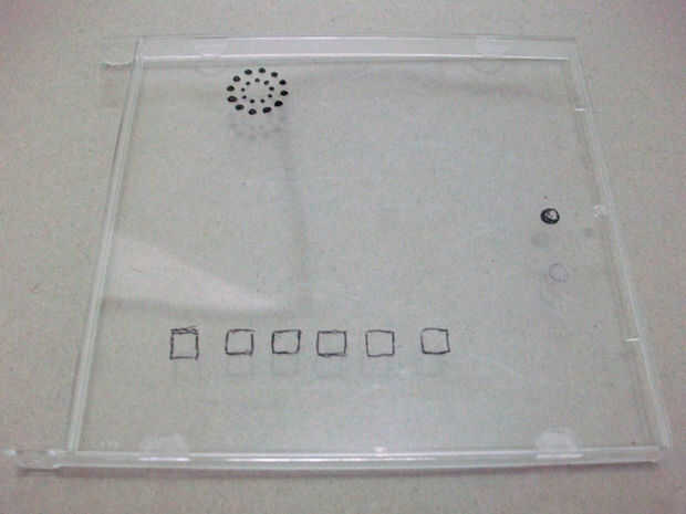 Dibujar el patrón en caja CD con marcador para poner el circuito, altavoz y potensiometer. Es realmente ayuda para la perforación.