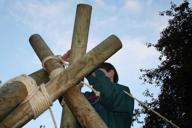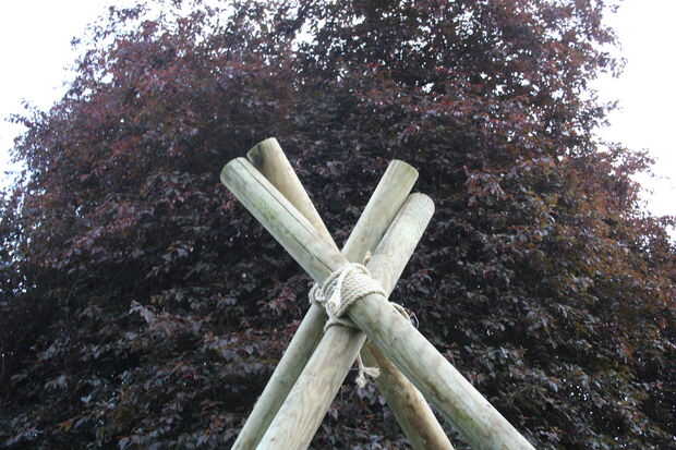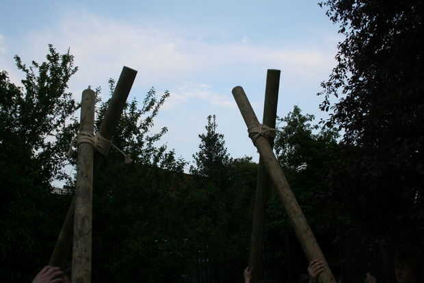 En mi último proyecto pionero que hemos construido un sencillo vaivénEn este instructivo vamos a utilizar exactamente los mismos nudos, número de polos y métodos para construir un puente de mono.  Como el último que estamos utilizando el mismo árbol