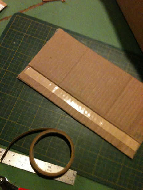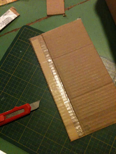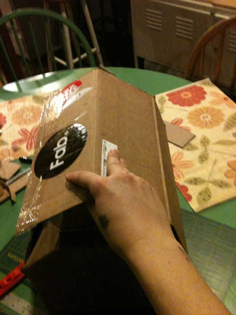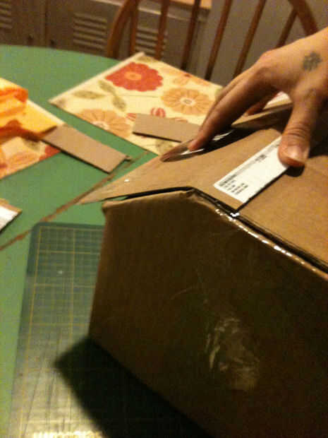 Coloque una tira de cinta de doble cara a lo largo de la parte inferior de la nueva tapa de 1 pulgada. (Puse la cinta en la parte inferior de esta solapa para que la parte delantera de mi cubierta tendría un borde liso). Pulir la cinta con la parte inferior lisa de su corte de caja, retire el papel y añadir otra tira para cubrir completamente esta parte inferior de la aleta nueva con cinta de doble cara (si usas 1 pulgada cinta de doble cara no es necesario repetirlo, estaba usando 1/2 pulgada). Pulir y quitar el forro.