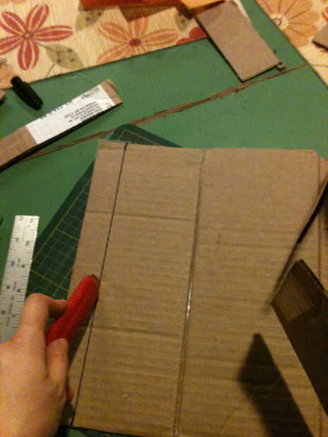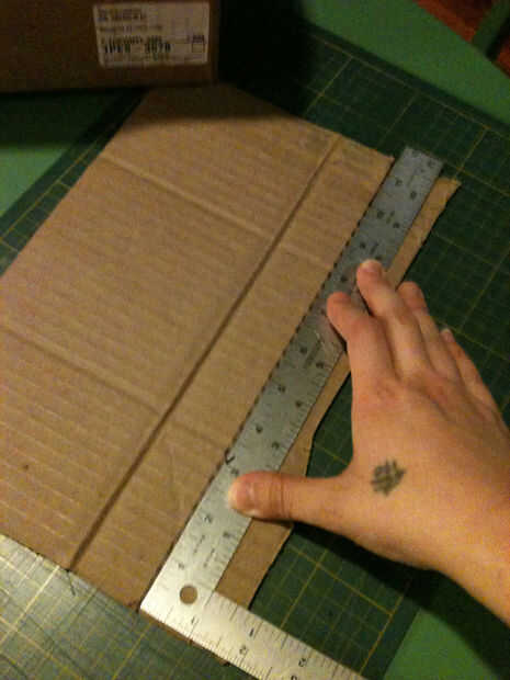 Cuando se mantiene la cubierta cerrada notará que hay un "labio sobresaliente". Sostienen la cubierta de cierre, use el rotulador para marcar donde la fachada exterior se une con el labio saliente por debajo de ambos lados. Se voltea la caja en el tablero de lámina perimétrica corte, utilizar la regla de L a trazar una línea recta uniendo estos puntos. Utilice el lado embotado de su corte de caja para esta línea.