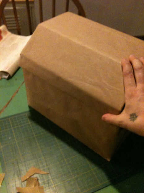 En segundo lugar. desde que tuve una larga hoja de papel marrón del arte decidí envolver primero la longitud de la caja. Longitud aquí = parte superior de la pared frontal, debajo de neath, hasta la pared posterior, a través de la cúpula sobre y debajo del borde de la cerradura. Cubriré los lados más tarde para disfrazar mi fichas de papel.