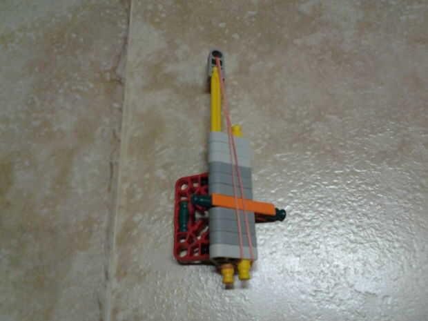 una pistola sencilla de unos trozos de KVG y una banda de caucho para disparar clips de papel.Paso 1: construir 2 palos amarillos y con solo 2 clips al lado de un conector y conectar los palitos en los conectores.Paso 2: acabado un conector final con