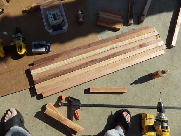 Lo llevé a MakerPlace con sus sierras de madera muy bonito. Comencé cortando los tablones laterales de bambú a bajo 1' (asegurándose de cortar todo a la misma longitud y minimizando residuos). Elijo hacer 16 14 trozos de longitud y lado.