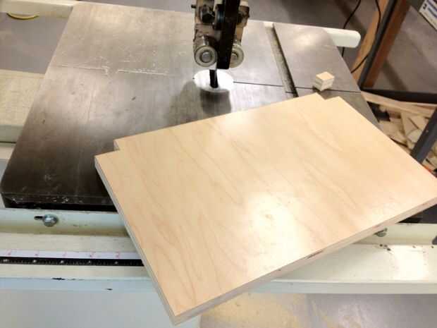 Ahora que tengo mis líneas de corte grabados sobre el material, tomé un paso en la carpintería para realizar los cortes. Utilizando una sierra de mesa Había recortado el estante hacia fuera. Y con la Sierra de cinta recorte las esquinas de la plataforma y las piezas laterales.