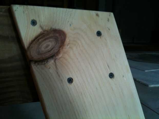 Después de averiguar la orientación de cada piezas en seco de ajuste (un poco complicado porque las piernas se extensión en dirección diferente), use pegamento en ambas parte y atorníllelos juntos. Recuerde, el pegamento es como un lubricante cuando está mojado, le puse un par de pequeños clavos después de todos los bordes alineación con piezas de la cerradura dos juntos antes de tornillo de los que no mover la alineación. La imagen muestra tres clavos del clavito pequeño - dos por el nudo y por el tornillo de la esquina de abajo derecha.