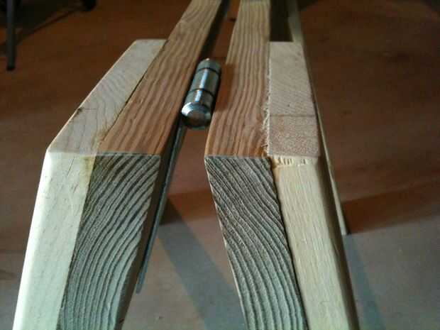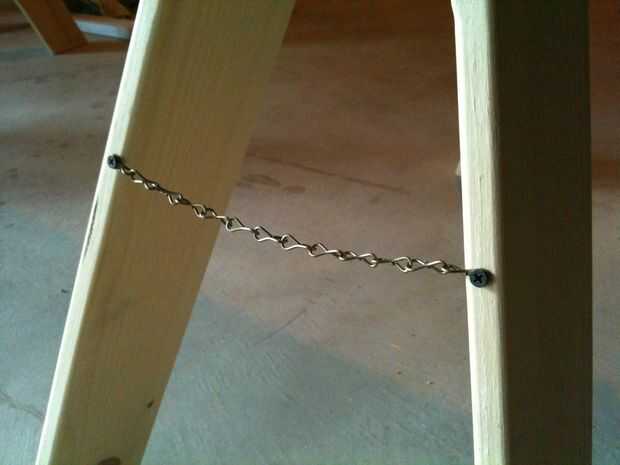Por último, utilizo alguna cadena sobrante para asegurar que las dos piezas plegables no se separarse demasiado bajo carga. Es solo 1 5/8" tornillos uno a cada lado. (uso más largo y pretaladrar los agujeros). La forma que fije la cadena es, mido 21" en mi mesa de montaje, coloque dos tornillos en cada extremo, dos piernas de un caballete de aserrar a eso dos tornillos de propagación y sujete la cadena. Hice 21" por el siguiente cálculo aproximado: 8" + 8"+ 5 x 1" = 21"(refieren a step2, W + W + 5 x espesor del material en 15 grados).