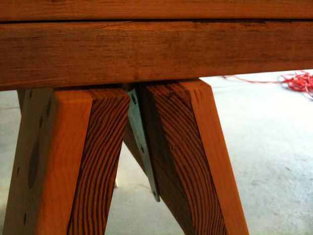 Hay 8 juntas total en este par de caballetes, la manera de unirse a ellos es lo mismo. Seco forma una viga y dos piernas juntas las piezas (una en cada lado) sobre una superficie plana. Pongo un par de corte de piezas de la viga bajo las piezas de la pierna en el otro extremo como espaciadores para la Asamblea se sienta plana. Mis rayos son 1" de espesor y las patas son de 3/4" densamente, decidí poner tornillos a través de la pata sobre la viga así puedo tener más material de la mordedura.