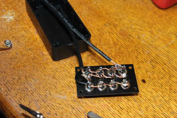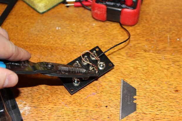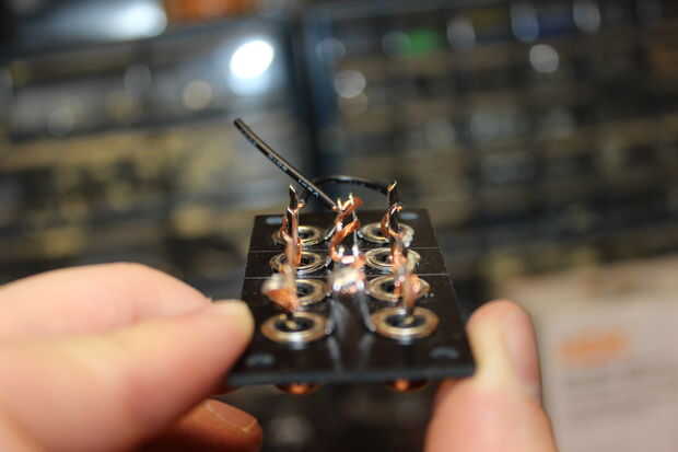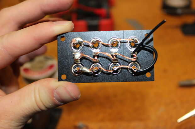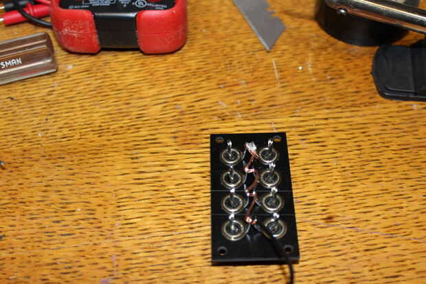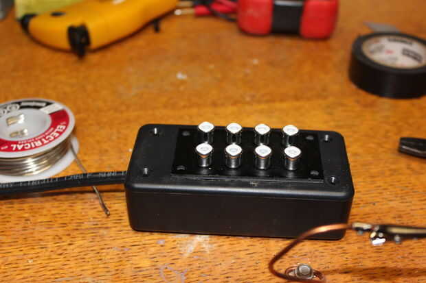 Si los cables están muy cerca de tocar y crees que poniendo juntos se moverá que los hilos de silicona entonces solo queda esperan. En su lugar puse juntos un solo LED en un conector RCA, cerré la caja pero no atornillar juntos todavía, conectado y enciende la fuente de alimentación. Si la luz encendida para arriba, nada estaba tocando y podría atornillar la caja. Si apaga la fuente de alimentación, luego desordenado y un alambre.