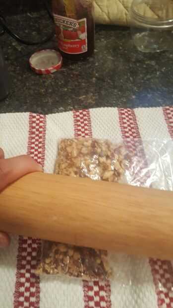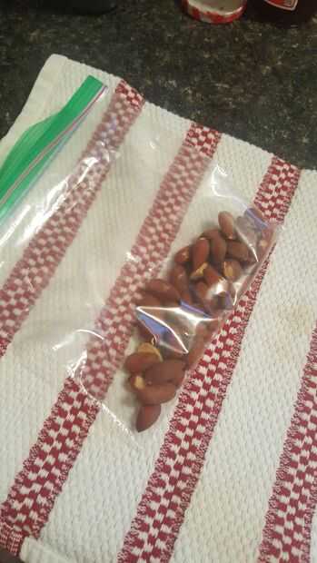 1. Coloque 1/4 de taza de almendras tostadas saladas en una bolsa de plástico.
