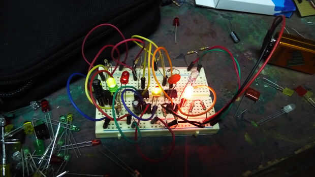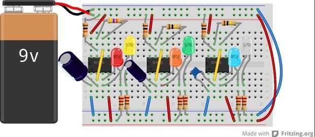, la salida de onda cuadrada enciende y apaga dos leds. La frecuencia está dada por el capacitor entre las patas 1 y 2, así cambiando los valores del condensador cambia la frecuencia de que los leds se encienda, experimentar y elegir el que como la mayoría. Aquí tratamos de que los leds cambian su frecuencia a una alta tasa, para que cuando el circuito se pone a girar ve como un continuo.
