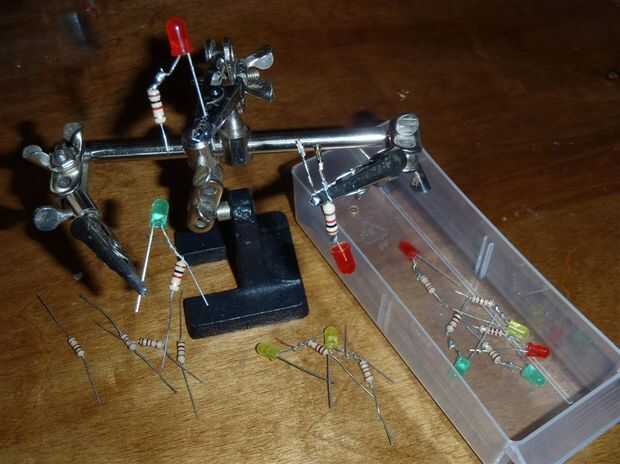 - Tomar uno de los plomos de un resistor del ohmio 1 k y envolver alrededor de uno de lo LED lleva una media pulgada hacia abajo desde el LED - pone la resistencia en el ánodo del LED (el cable más largo), pero lo importante es ser consistente.