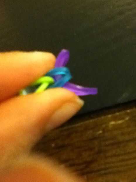 primero lo primero, necesita crear el perímetro de la pulsera, coloque su primera banda de cualquier color y colocar desde el centro a la izquierda y desde el centro a la derecha, así como en la imagen. Luego tomar cualquier banda del color de su ele