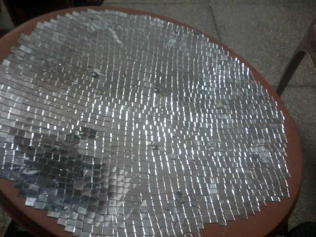 pegar pequeños pedazos de espejo en el plato con la ayuda de pegamento, espacio entre los espejos debe ser menos posible