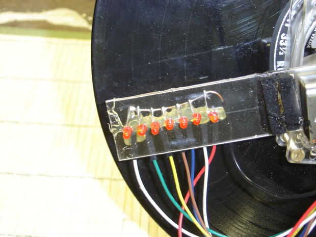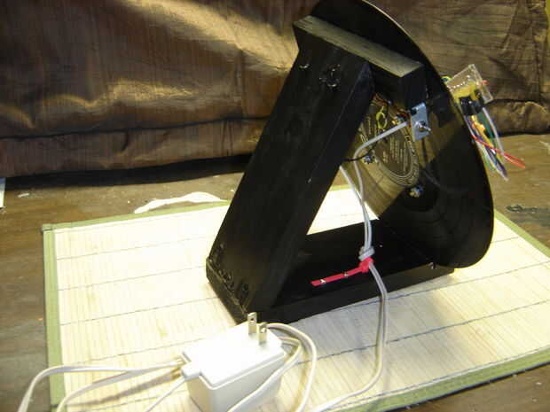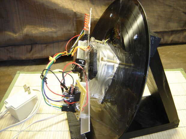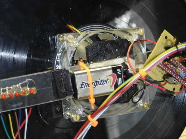 Conectado el ventilador (que tiene el brazo conectado) a un viejo disco LP. El inturn registro se une a la base.