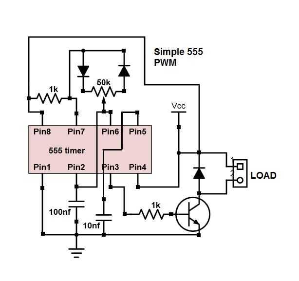 He incluido el circuito esquemático y disposición del PWB, el diseño de PCB puede tener que modificarse basado en el transistor que se utiliza. El transistor determina cuanta corriente se puede controlar, utilicé un 2n2222a que puede suministrar hasta 800ma. Los voltajes que pueden ser controlados desde 5-15 voltios. Usé mi 555 PWM para controlar la velocidad de 3 12 voltios DC ventiladores de ordenador que utilizan 180ma cada.
