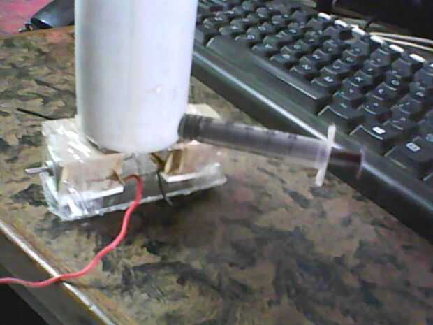 7 mantenga la jeringa en el agujero hizo la botella para toma de agua dulce cuando el pistón en jeringa pegamento caliente pulled.keep para asegurarse de que no hay ninguna salida del agua.