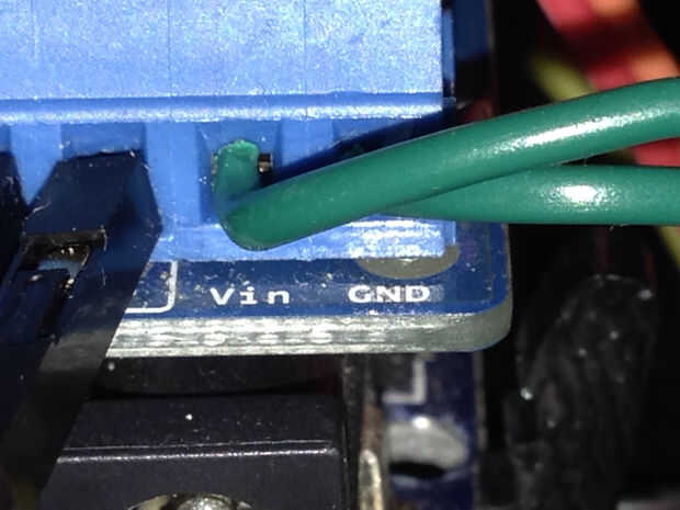 Después de que el código ha sido cargado en el controlador, puede conectar la batería hacia arriba. Si está usando un soporte de la batería (con sin pilas en este momento), conectar el cable negro a la potencia del motor de escudo del motor en tierra y el rojo a VIN. Si usted tiene una li-po o Li-ion, puede utilizar los cables del puente como en la imagen para conectar la batería, otra vez negra a GND y el rojo a VIN.
