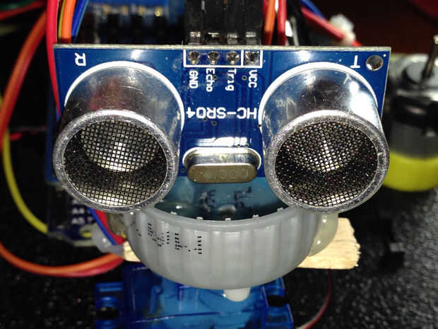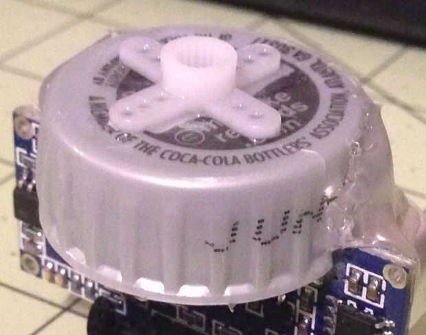 Para colocar el servo en el bot, cortar un pedazo pequeño de doble cara cinta adhesiva y pegar en la parte inferior del servo SG90. Tomar el servo y coloque en el centro de los dos orificios en la parte delantera del chasis. Nota: Si tienes dos tornillos que encajan en los agujeros de servo y el chasis que sean lo suficientemente largos, puede utilizarlos :-) Tome la parte superior de botella de plástico de soda y cuidadosamente corte una hendidura a través de él (ver imagen abajo), lo suficientemente amplia como para la Junta del sensor a. Utilice un poco de pegamento caliente o pegamento de caucho en ambos lados para mantener en su lugar. Ahora toma el servo Cruz accesorio cuerno "+" y péguelo a la parte superior de la tapa de la botella. También puede perforar un pequeño agujero con una broca pequeña o incluso un destornillador pequeño en el centro de la parte superior para ayudar a asegurar el Monte aún mejor en el servo con un tornillo.