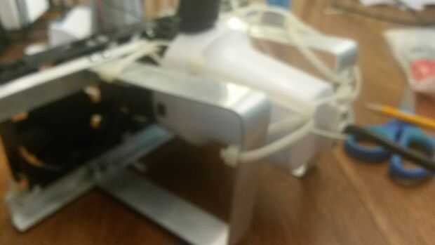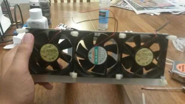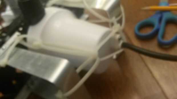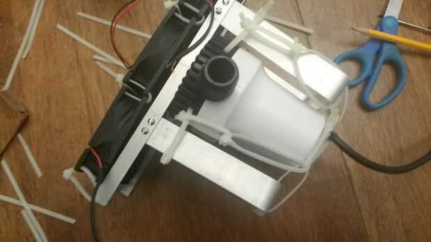 Ahora que han construido la estructura, tomar los 3 ventiladores de 80mm computadora y zip unir los motores. marcar algunos agujeros en el marco para zip empate el Banco motor en la parte posterior del marco. Luego coloque la bomba de achique para que la salida es hacia fuera de la parte superior. Para la parte de bomba de achique puede tener utilizar algunas competencia de lazo creativo zip.