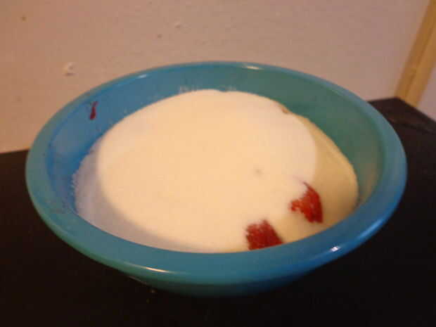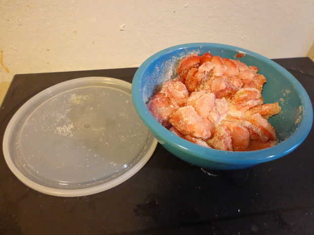 Ponga la tapa sobre el recipiente, (manteniendo la tapa apretado) agitar el recipiente para cubrir todas las fresas en el azúcar.