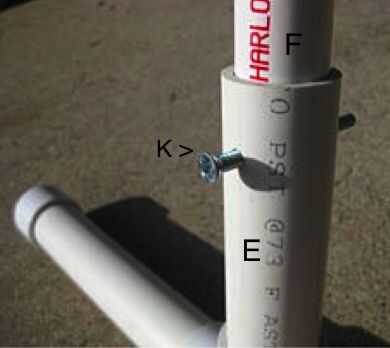 Taladro 1/4" de diámetro a través de la marca en [E] para extender hacia el otro lado. Esto hará un agujero a través de ambos [E] y [F]