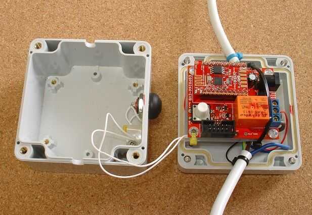 Los dos tableros son montados en la tapa de un ABS 80 mm x 80 mm x 55 mm o recinto más grande. Por ejemplo, Hammond fabricación ABS IP65 caja forma parte No RP1065 o similar (~US5.60 de digikey). El momentáneo IP67 de botón pulsador normalmente abierto está montado en el cuerpo de la caja. Por ejemplo CW Industries GPB556A05BB (~ US4 de digikey). Algunos empujar botones vienen con construido en el indicador LED. Si tienes uno de esos, usted puede conducir el led mediante una resistencia de 270 ohm de la GPIO5 de OLIMEX-EVB (pin 12 en el conector de borde) a la tierra para indicar cuando el relé esté siendo conducido.