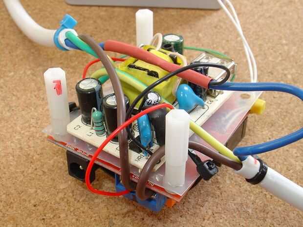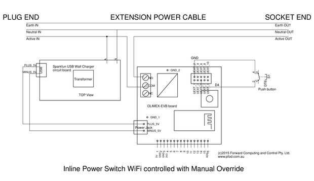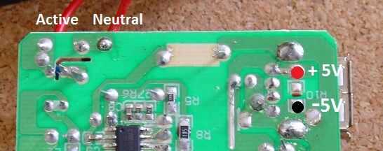 El cable neutro es corte y un hilo neutro negro añadido a conectar a la tarjeta USB. El cable activo es corte y entrada conectada al borne de tornillo de relé COM y saliente activo conectado al borne de tornillo NO. Un cable (rojo) funciona desde el terminal COM al pin activo en tablero de energía USB.