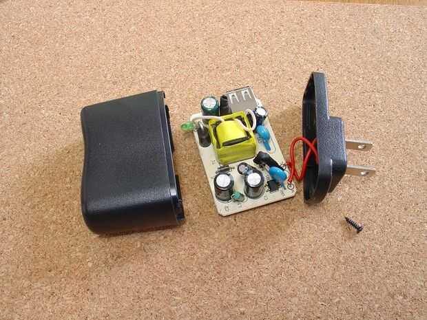 Cargador de pared USB de Sparkfun es celebrado junto con a tornillo. Quite el tornillo, hacer palanca de la base y extraiga la placa de circuito y retire los cables de alimentación.