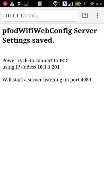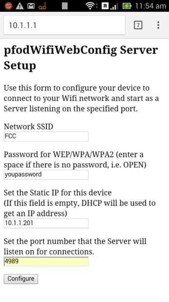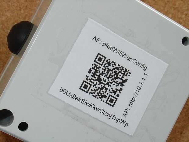 Si se pulsa la tecla cuando la Junta pone en marcha, la unidad se pone en modo punto de acceso con un SSID pfodWifiWebConfig . Para proporcionar una conexión WiFi segura para configurar el SSID de su red local y la contraseña, el pfodWifiWebConfig usa la pfodSecurityCode como una contraseña. Es el código QR que ya se ha unido al interruptor de encendido.
