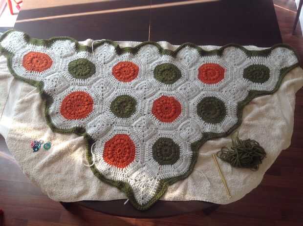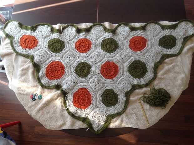 Ronda 2: interruptor colores, 1Sc en cimas planas de octágono por todo el borde. * 2Hdc en el borde exterior, 2Dc, 3Tc (en valles), 6Dc a través de la parte inferior plana de valley.* repetir.