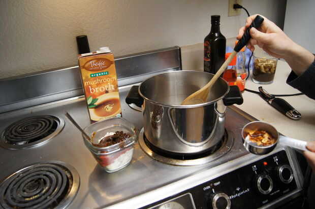 Después de que hayas añadido el caldo de verduras (a una pulgada y media por debajo de la parte superior), añadir las setas que has sido remojo y dejar que el caldo hierva a fuego lento por un tiempo. No hay límite de tiempo real, pero me gusta hacer esto primero y luego limpiar las verduras mientras está Guisando.