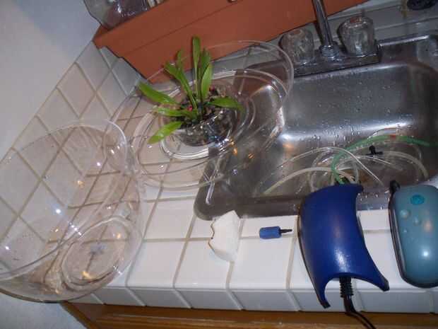 2 tazones de plástico, bandejas, etc.... en el cual uno puede caber encima de la otra. Busque en la sección de florero o tupperware o taza/tazón de fuente de su supermercado local. Hay raramente cualquier cubos claro. Idealmente, uno debe ser más similar a un cuenco y los otros más bandeja.