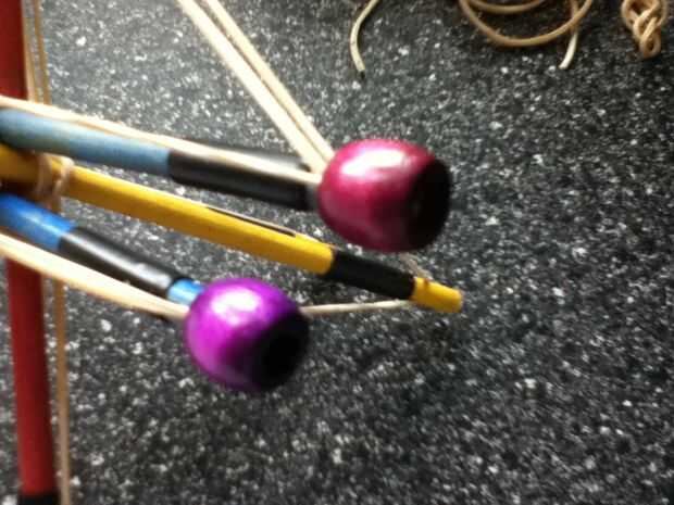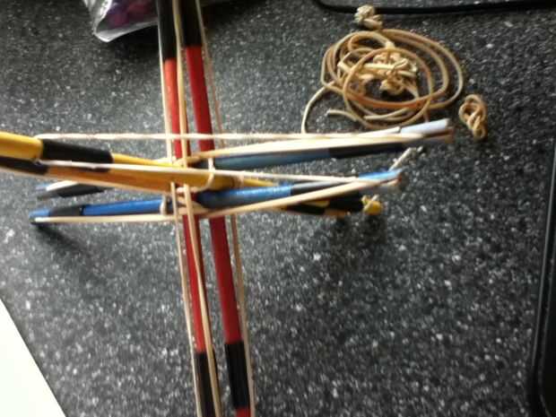 en el centro de cada banda de goma donde va entre el palo de cruce, strech hasta el extremo de la palanca de cruce.